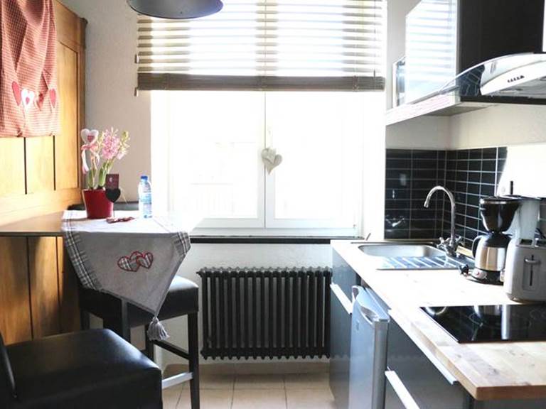 Equipée d'un bureau, coin salon, d'une cuisine équipée, d'une salle d'eau avec douche, WC, lavabo, sèche cheveux, distributeur gel douche/shampoing.