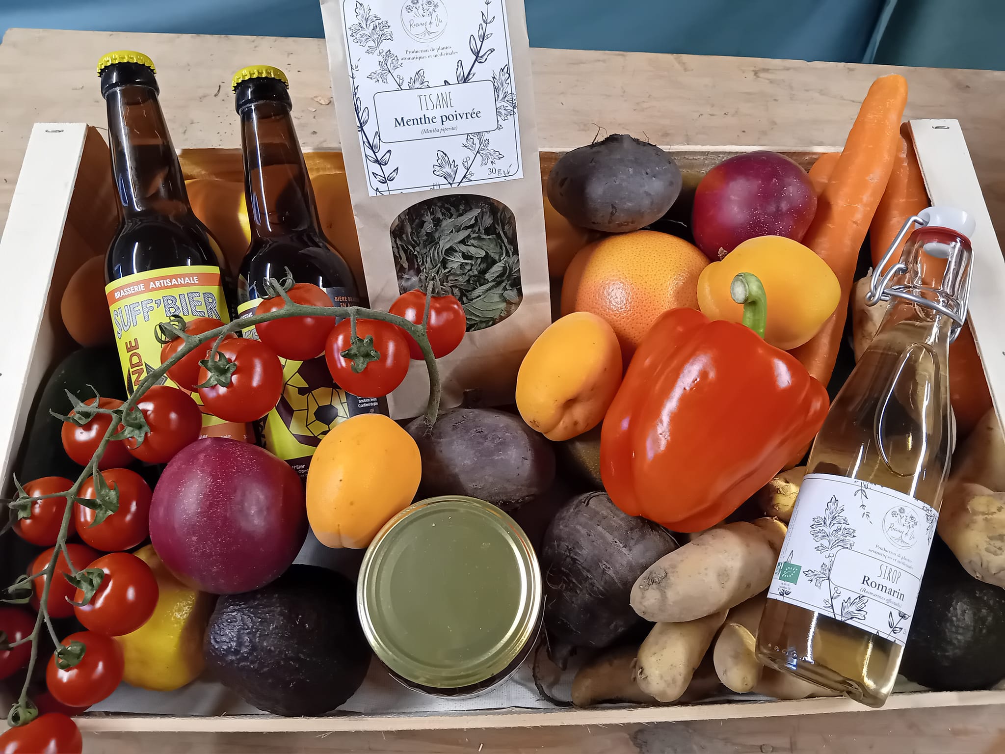 Vente directe de paniers de fruits et légumes, pommes de terre, produits locaux, plants de légumes.